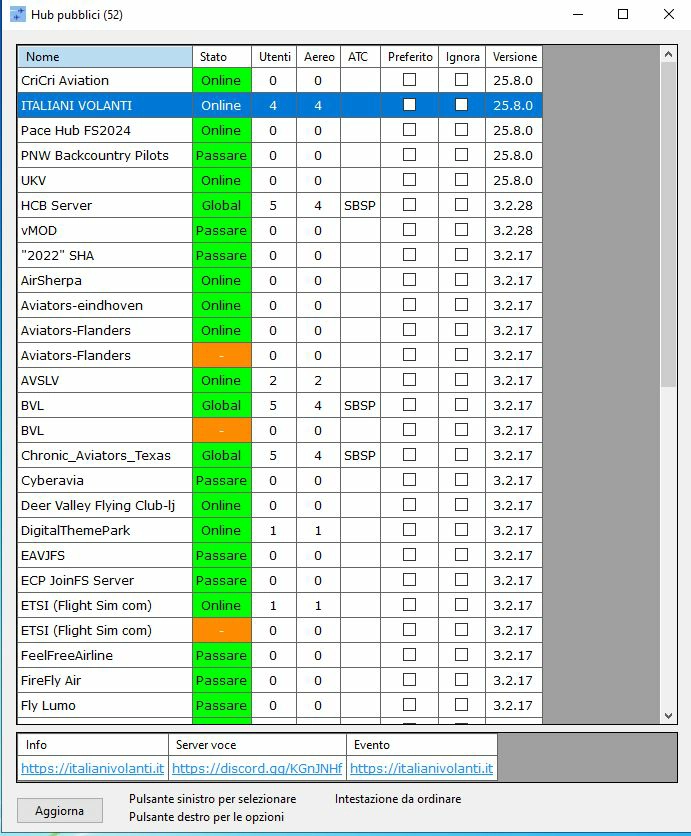 Shows the list of known public hubs that other people are running, usually on a permanent server. The list includes information about the hub, how many clients are connected, how many aircraft and other objects are in the session. Click on a hub in the list and further details are shown in the box below the list. To join the hub, click the Join button below the details.