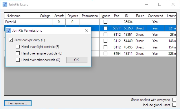 JoinFS include un proprio metodo per condividere le cabine di pilotaggio con altri piloti. Non ci sono restrizioni sul tipo di aeromobile che è necessario selezionare quando si entra in un’altra cabina di pilotaggio. Tuttavia, se il vostro aeromobile è significativamente diverso, è probabile che si verifichino comportamenti anomali. Il vantaggio è che è possibile scegliere un tipo simile o un aeromobile di un altro produttore e continuare a condividere la cabina di pilotaggio. Per entrare nella cabina di pilotaggio di un altro velivolo è necessario avere il permesso del proprietario di tale velivolo. L’eccezione è se si entra in un velivolo registrato di cui si è proprietari. Il proprietario del velivolo può concedere il permesso di entrare nella cabina di pilotaggio e può anche assegnare diversi set di comandi a diversi copiloti. I comandi sono divisi in tre gruppi separati: “volo”, ‘motore’ e “altro”. È possibile decidere di assegnare uno o tutti questi gruppi. JoinFS supporta un numero illimitato di copiloti/passeggeri in un unico velivolo.