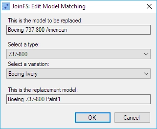 Se non lo avete già fatto, selezionate “File>Scan For Models” dal menu per creare un elenco interno dei velivoli disponibili nel vostro simulatore. Saranno necessarie ulteriori scansioni quando installi o rimuovi aeromobili aggiuntivi. Se utilizzi Tacpack di VRS Simulations, assicurati di includere la cartella “Misc” nella scansione. Questa operazione può essere automatizzata, ogni volta che viene avviato JoinFS, dal menu “File>Impostazioni” e dall’opzione “Scansiona modelli all’avvio”. Un modello può essere modificato in qualsiasi momento dall’elenco degli aeromobili, vedi menu “Visualizza>Aeromobili”. Clicca sull’aereo, quindi clicca con il tasto destro del mouse e seleziona Sostituisci. Ti verrà presentato il seguente modulo. Questo modulo mostra il modello da sostituire nella parte superiore e il modello sostitutivo nella parte inferiore. Utilizza i due menu a tendina al centro per scegliere il tipo e la variante del modello sostitutivo. Una volta confermato cliccando sul pulsante OK, i modelli verranno aggiornati istantaneamente nel simulatore. JoinFS ricorderà tutte le sostituzioni effettuate e in qualsiasi momento potrai visualizzarle e modificarle dal menu “File>Corrispondenza modelli”. Ti verrà presentato il seguente modulo.